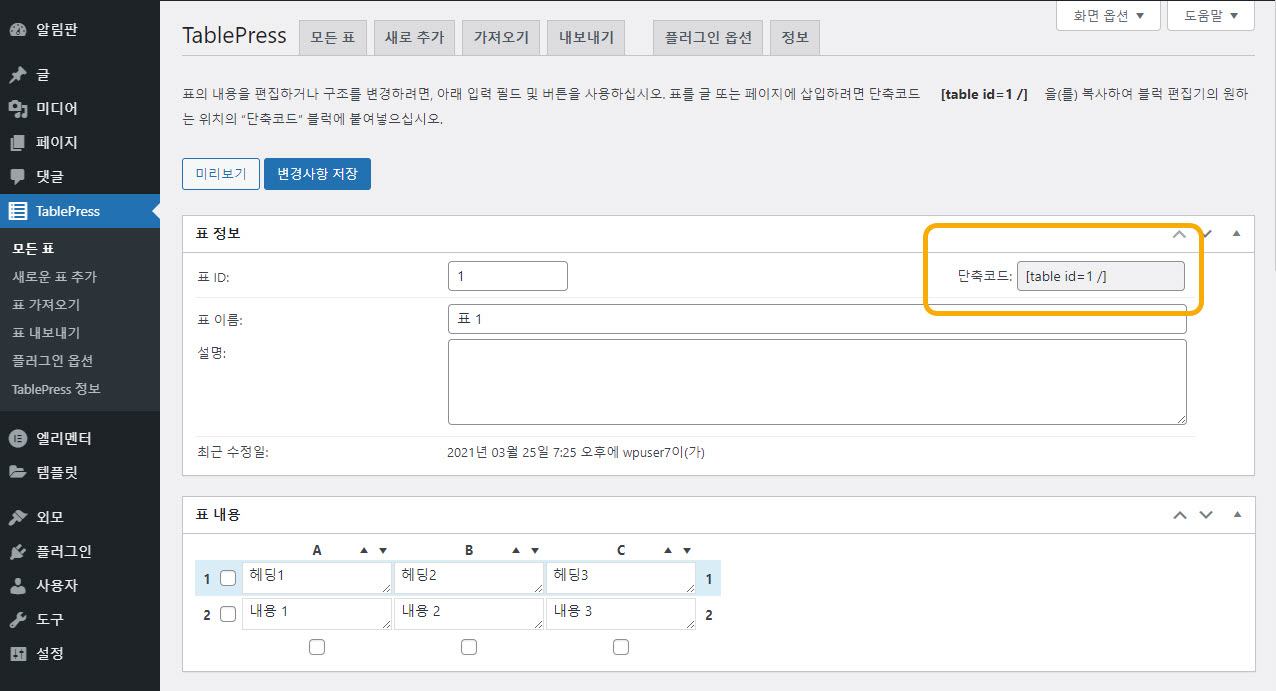 TablePress에서 표를 만들고 단축코드(아래에서는 [tableid=1 /])를 복사합니다.