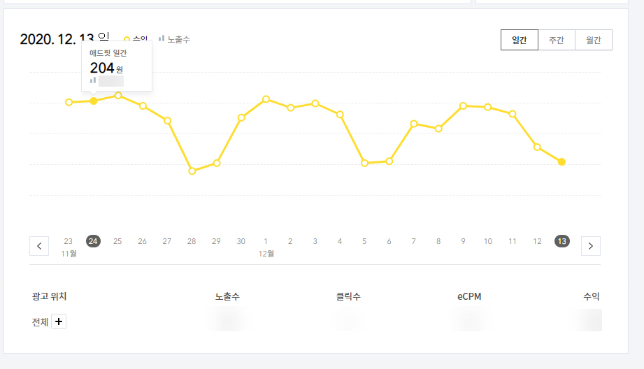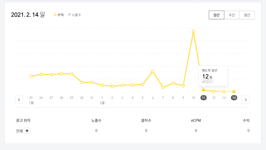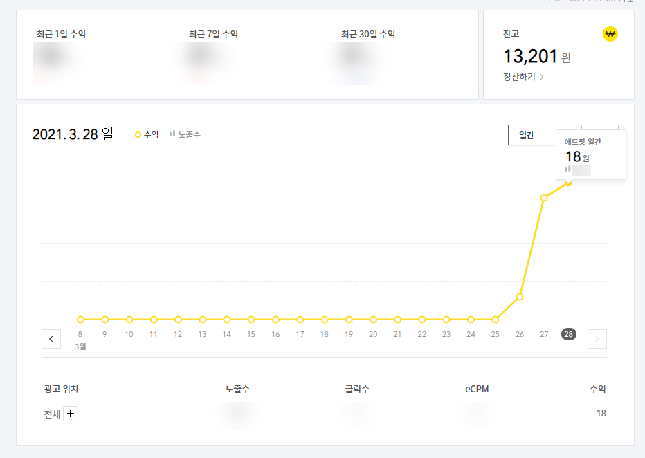 광고 표시 위치가 안 좋아서 수익이 낮은 것은 이해하지만 애드센스 광고 수익에 비해 낮아도 너무 낮네요.