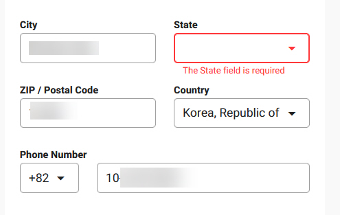 State 필드에 값을 입력하도 "The State field is required"라는 경고가 표시될 수 있습니다. Country를 먼저 입력한 후에 State 필드에 도나 시를 입력하도록 합니다. 아래 그림은 값을 입력했을 때 경고가 표시되어 값을 삭제했을 때를 보여줍니다. 경고가 표시되어도 입력하고 넘어가면 됩니다.
