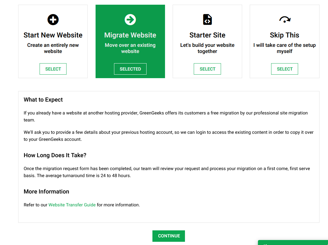 새로 워드프레스 사이트를 만들려면 Start New Website를 클릭하고, 사이트 이전을 원할 경우 Migrate Website를 선택하도록 합니다.