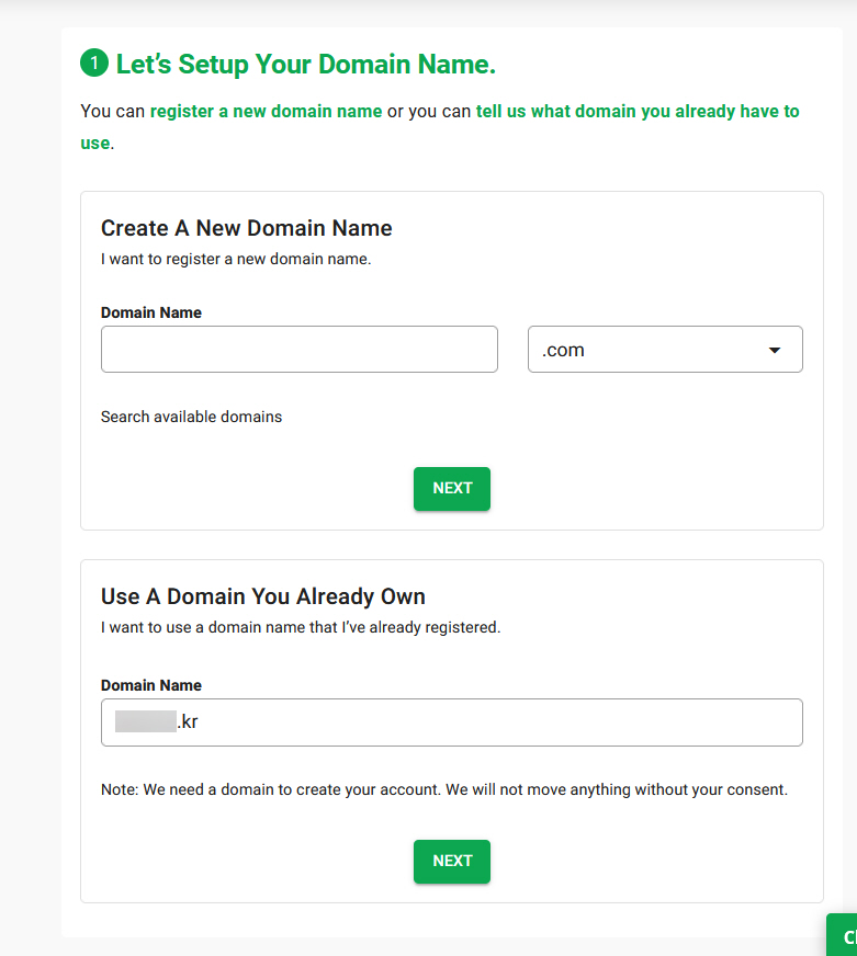 - 새로운 도메인을 등록하고 싶은 경우에는 Create A new Domain Name 섹션에서 도메인 이름을 입력한 다음 Next 버튼을 클릭합니다.