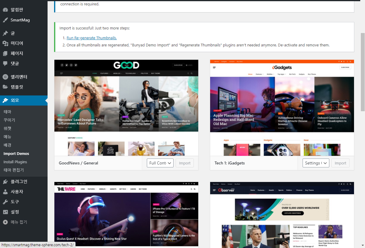 데모를 설치하려면 Bunyad Demo Import 플러그인을 설치하도록 합니다. 플러그인을 설치하고 활성화한 다음, 외모 > Import Demos를 클릭합니다.