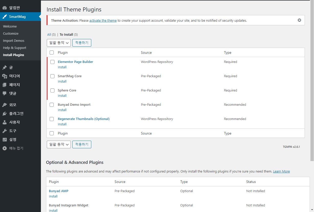 위의 그림에서 Required (필수)로 표시되어 있는 3개 플러그인은 반드시 설치하여 활성화해야 합니다. 아래의 Recommended (권장)로 표시된 플러그인은 권장 플러그인으로 설치해도 되고 안 해도 됩니다. Regenrate Thumbnails는 썸네일을 재생성해주는 플러그인입니다. 운영 중인 사이트에서 테마를 바꾸는 경우 이 플러그인을 실행하여 썸네일을 다시 실행해주어야 썸네일이 제대로 표시될 것입니다.