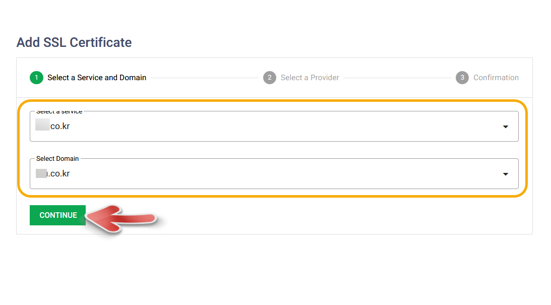 Select a service (서비스 선택)와 Select Domain (도메인 선택) 드롭다운을 클릭하여 SSL 인증서가 설치될 도메인을 선택합니다.