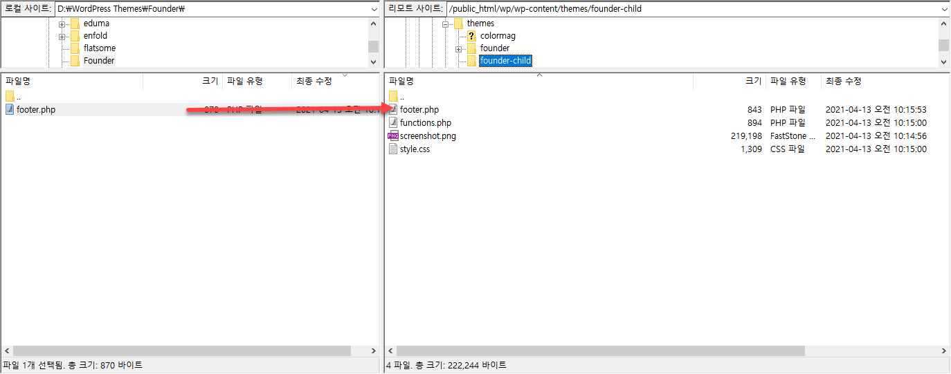 컴퓨터로 다운로드한 footer.php 파일을 차일드 테마 폴더(예:/wp-content/themes/founder-child)로 업로드합니다.