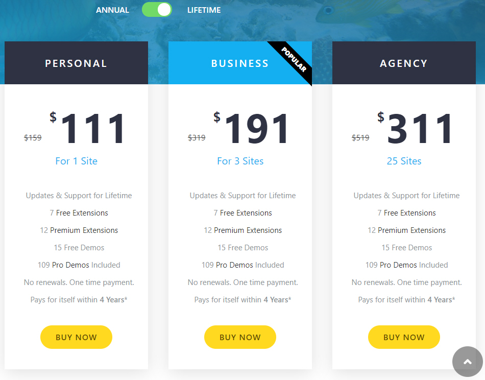 OceanWP 테마에는 연간 라이선스와 라이프타임 라이선스가 있습니다. 연간 라이선스는 매년 갱신해야 하며 비용이 저렴한 편입니다. 라이프타임 라이선스는 평생 동안 업데이트와 지원을 받을 수 있습니다. 대신 비용이 비싼 편입니다.