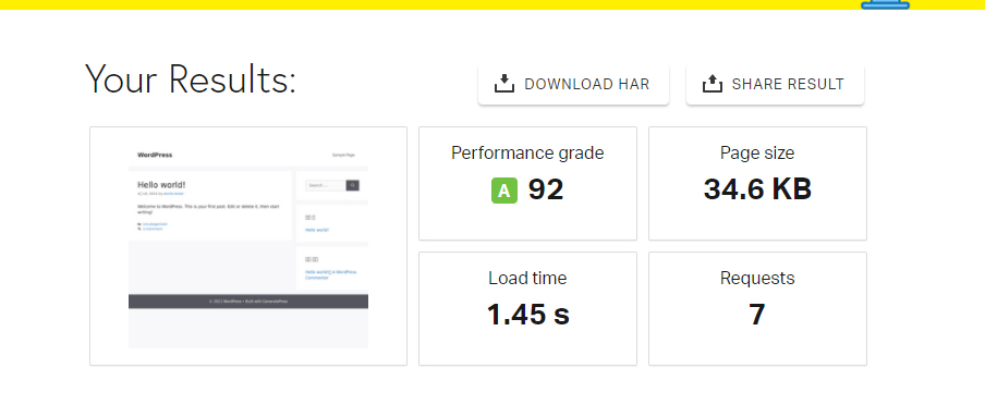 이 때문인지 사이트 속도(도쿄 기준)를 체크해보면 로딩 시간이 매우 빠르게 표시됩니다. GeneratePress 테마를 설치한 상태이고 이미지와 글 등 콘텐츠가 없는 상태이기 때문에 속도가 빠르게 나오는 것 같습니다.