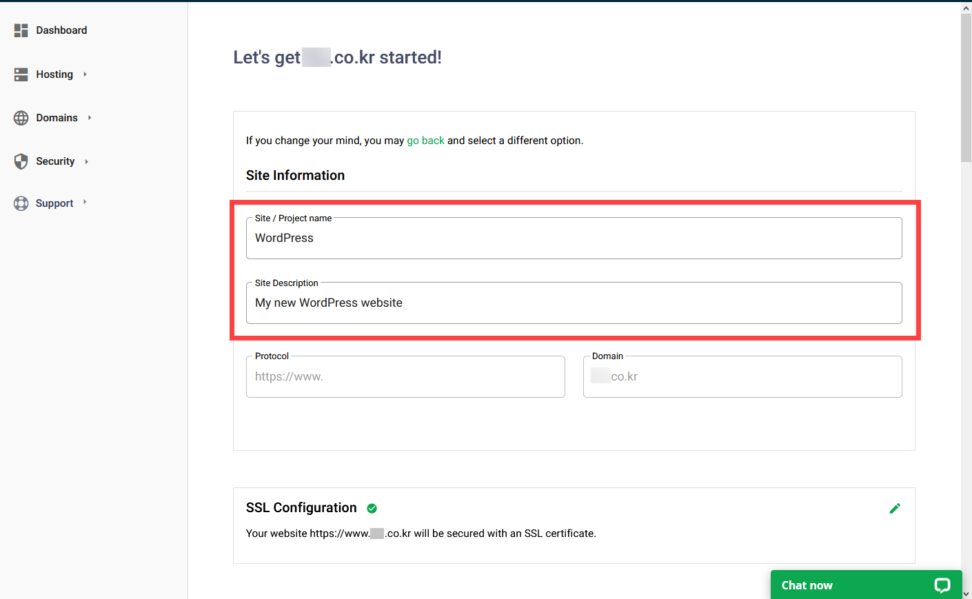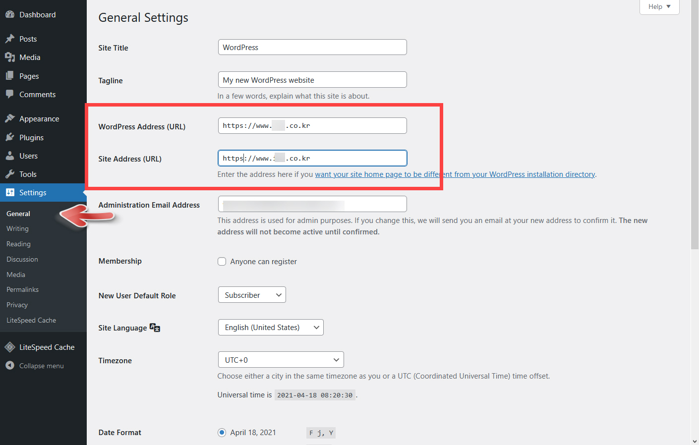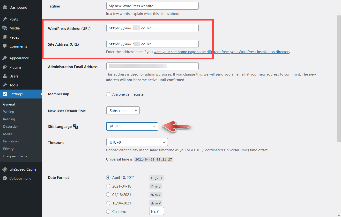 이제 사이트 주소가 http가 아닌 https 주소로 변경된 것을 확인할 수 있습니다. 이외에 필요한 작업을 하도록 합니다. 예를 들어, 사이트 언어가 현재 영어로 되어 있습니다. Site Language를 English에서 한국어로 변경할 수 있습니다.