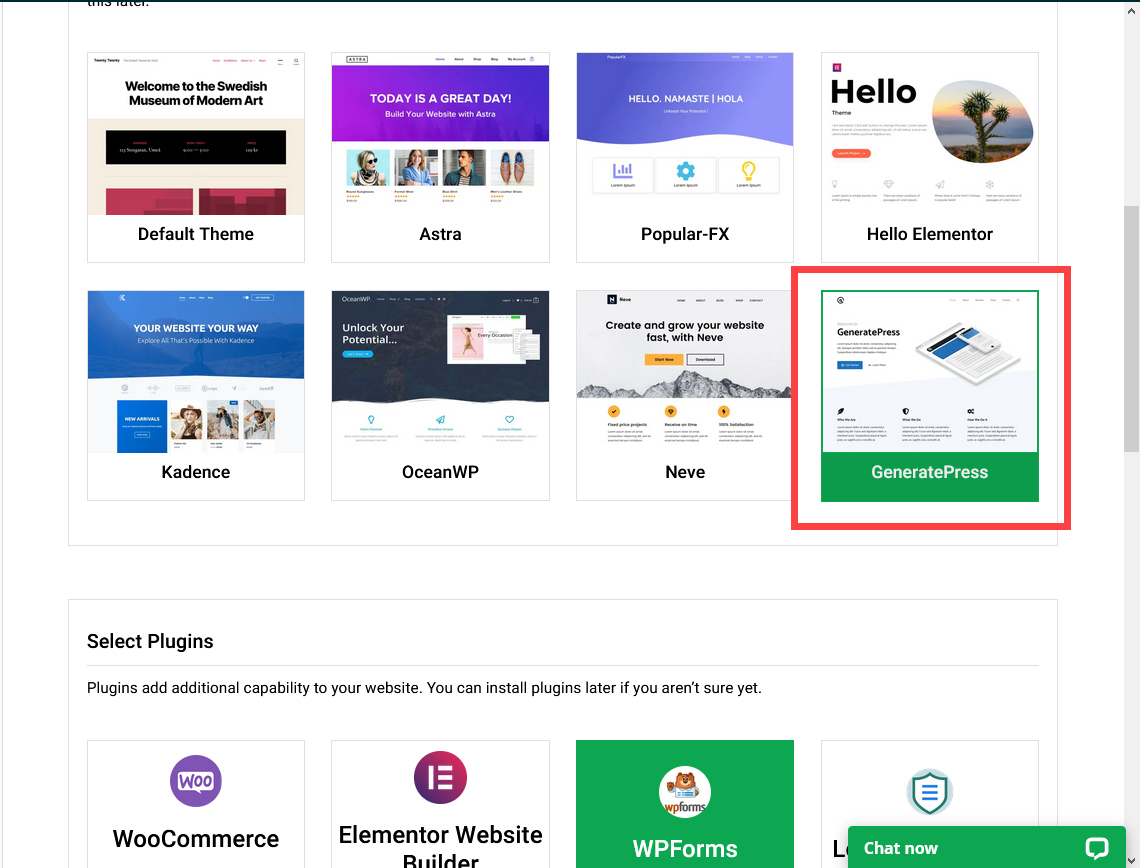 워드프레스에는 다양한 무료 및 유료 테마가 있습니다. 원하는 테마가 없더라도 아무 테마를 선택한 후에 워드프레스 관리자 페이지에서 다른 테마를 설치할 수 있습니다. 블로그를 운영한다면 GeneratePress 테마를 선택할 수 있습니다. 저는 거의 모든 사이트에 GeneratePress 테마를 사용하고 있습니다. 빠르고 커스텀이 용이하여 개인적으로 선호하는 편입니다.