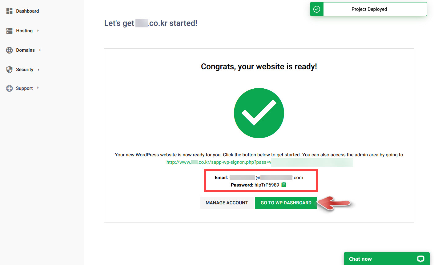 워드프레스 설치가 완료되면 Cograts, your website is ready 메시지가 표시되고 이메일 주소와 비밀번호가 표시됩니다.