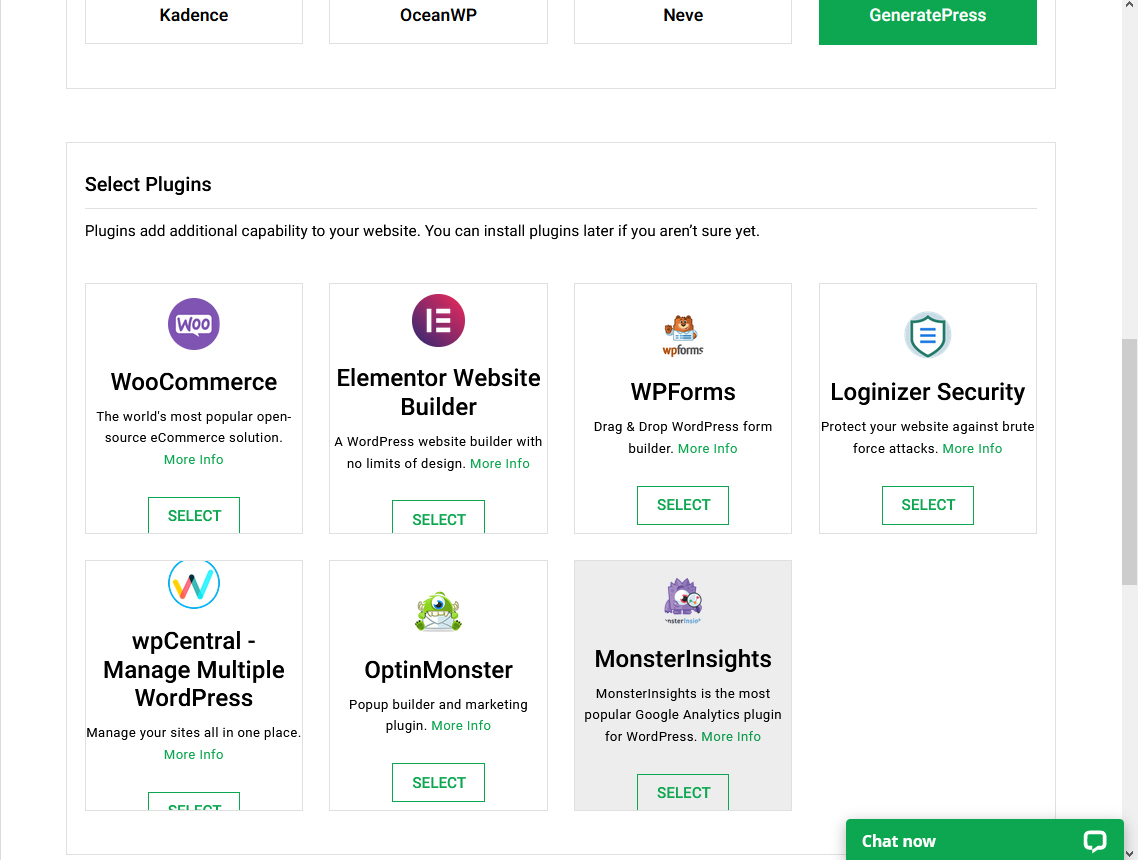 Select Plugins에서는 함께 설치할 플러그인을 선택할 수 있습니다. 나열된 플러그인은 모두 무료 플러그인으로 많은 사용자들이 사용하는 플러그인입니다. 엘리멘터 페이지 빌더(Elementor Webiste Builder)를 사용하면 코딩 지식이 없더라도 수월하게 사이트를 만들 수 있습니다.