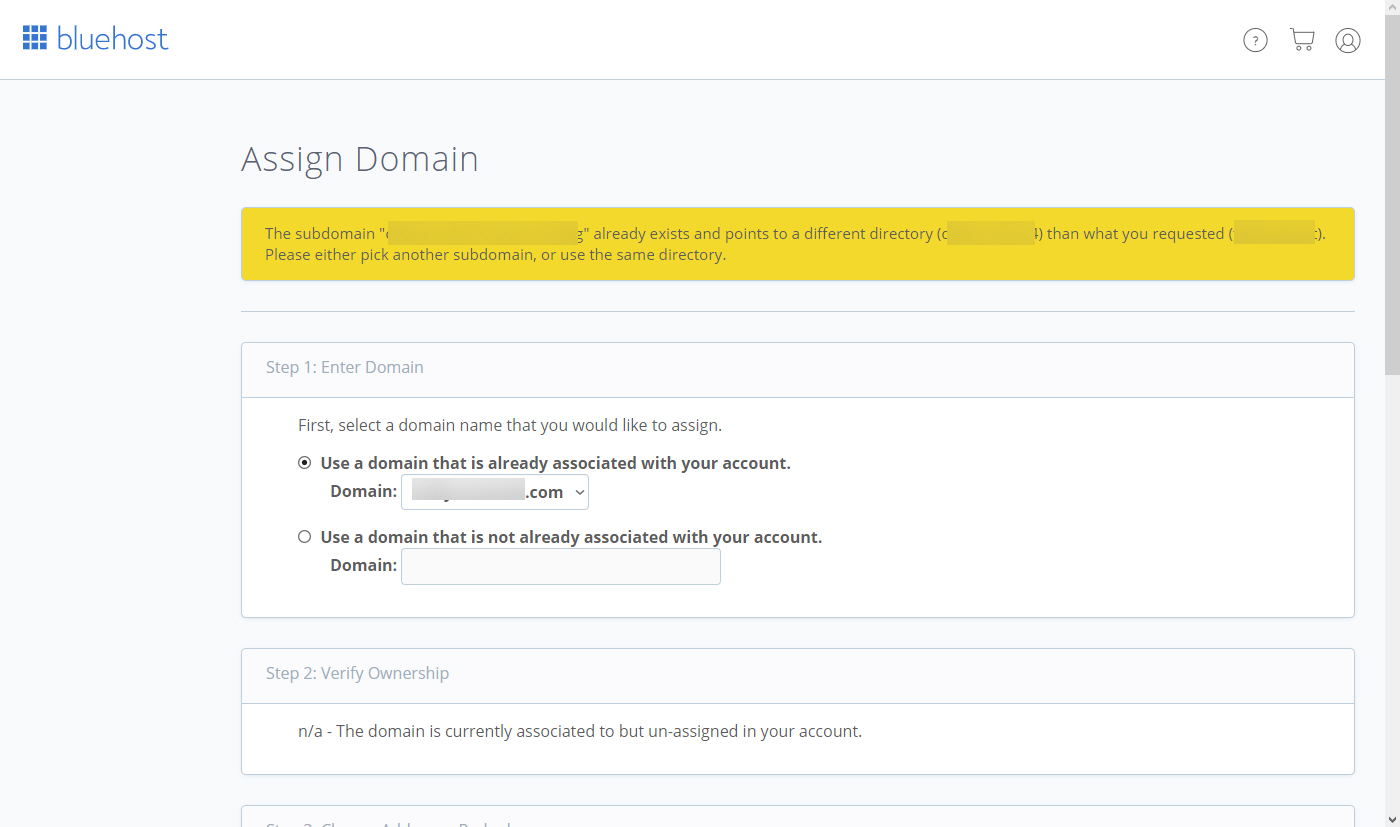 이 오류가 발생할 경우 서브도메인의 이름을 변경하여 진행하면 문제가 해결이 되지 않을 것입니다. 저는 서브도메인의 이름을 변경하지 않고 대신, Domains > Subdomains로 이동하여 해당 서브도메인을 제거(Remove)한 후에 다시 도메인을 Assign하니 문제가 해결되었습니다.