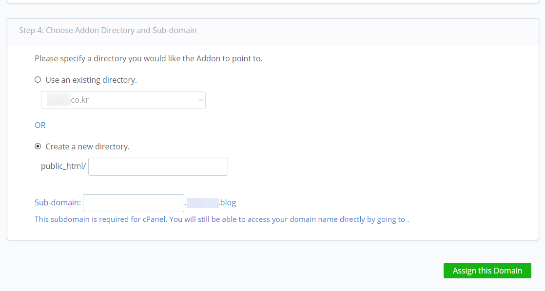 4단계. 애드온 디렉터리 및 서브도메인 선택 섹션에서 새로운 디렉터리를 지정하여 생성하도록 합니다.
