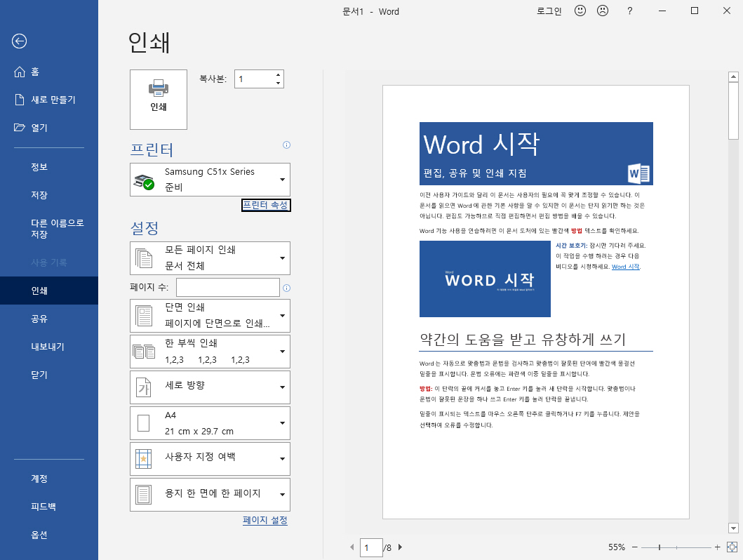 예를 들어, MS Word에서 인쇄 메뉴를 클릭하면 다음과 비슷하게 표시됩니다. 삼성 SL-C513 프린터기는 Samsung C51x Series로 인식됩니다.