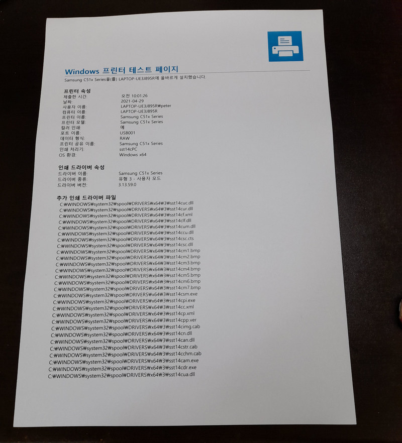 테스트로 인쇄해보니 문제없이 인쇄되었습니다. 토너를 흔드는 작업을 진행하지 않으면 인쇄 시 이상한 줄이 생성되는 등 문제가 있다고 합니다. 그런 경우 토너 카트리지를 꺼내어 잘 흔든 다음 다시 장착하면 문제가 발생하지 않을 것입니다.
