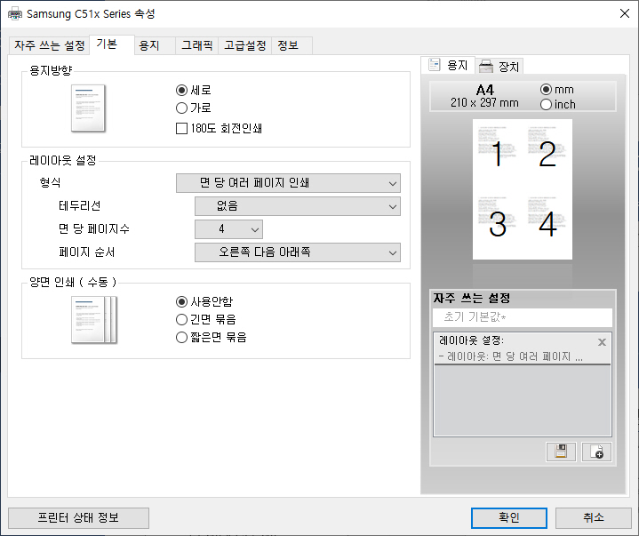 기본 탭에서는 용지방향(세로, 가로, 180도 회전인쇄), 레이아웃 설정(면 당 여러 페이지 인쇄, 페이지 순서) 및 양면 인쇄(수동) 옵션을 설정할 수 있습니다. 자동 양면인쇄는 지원되지 않고 수동으로 양면 인쇄가 가능합니다.