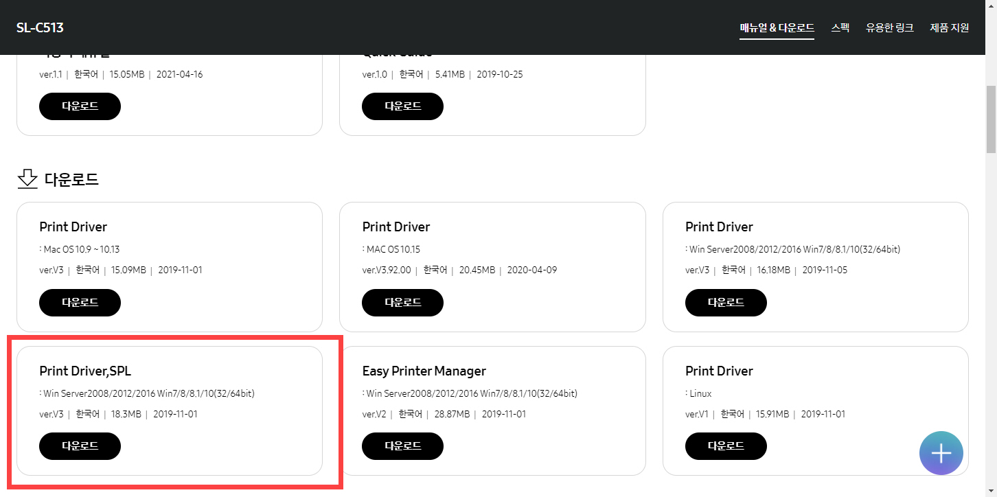위의 페이지를 방문하여 Printe Driver,SPL(윈도우 사용자인 경우)을 다운로드합니다. 맥OS 사용자는 아래 그림에서 버전에 맞는 Printer Driver를 선택하여 다운로드하도록 합니다.