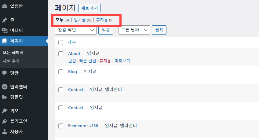 페이지 > 모든 페이지를 살펴보면 발행된 페이지가 하나도 없을 것입니다. 페이지가 하나도 없거나 혹은 페이지가 있더라도 임시글 상태이거나 휴지통으로 이동했을 수 있습니다.