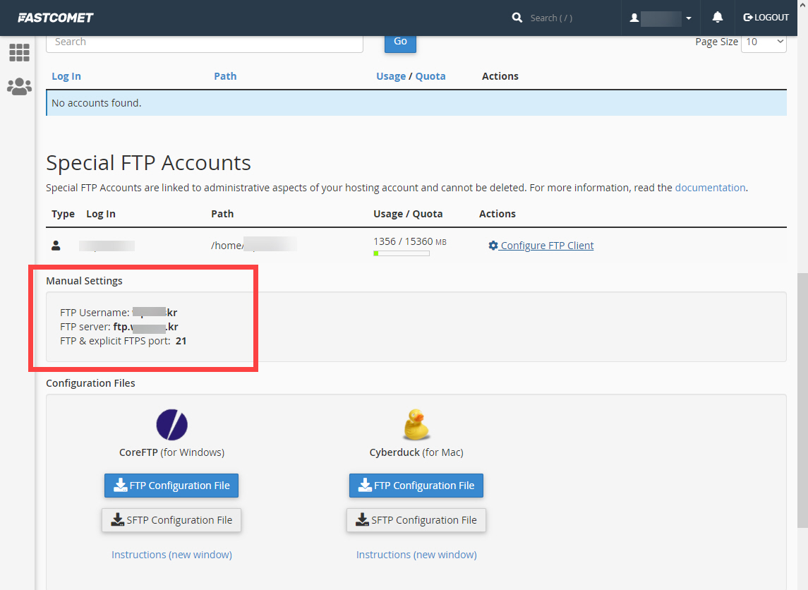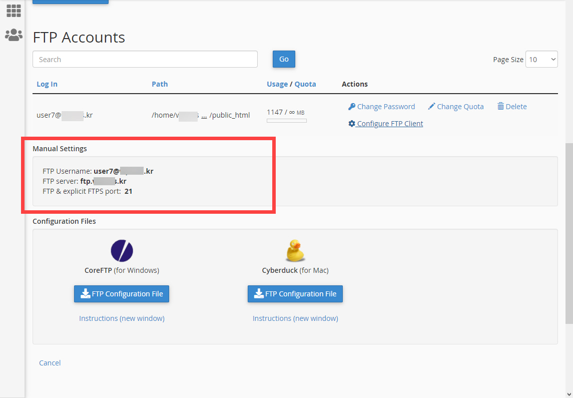 CoreFTP(윈도우용) 또는 Cyberduck(맥용) 클라이언트를 사용하는 경우 FTP Configuration File (FTP 구성 파일)을 다운로드할 수 있습니다.