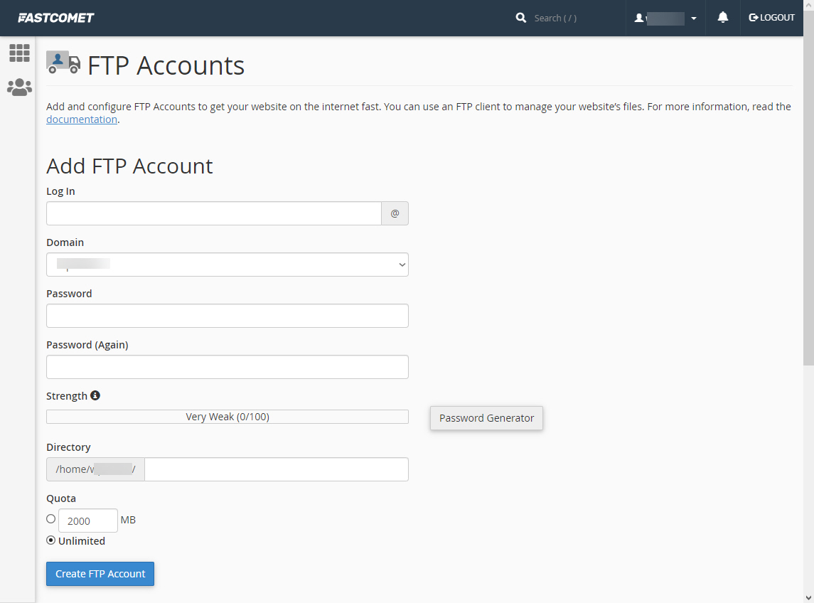 새로운 FTP 계정은 FTP Accounts 페이지의 Add FTP Account 섹션에서 추가할 수 있습니다.