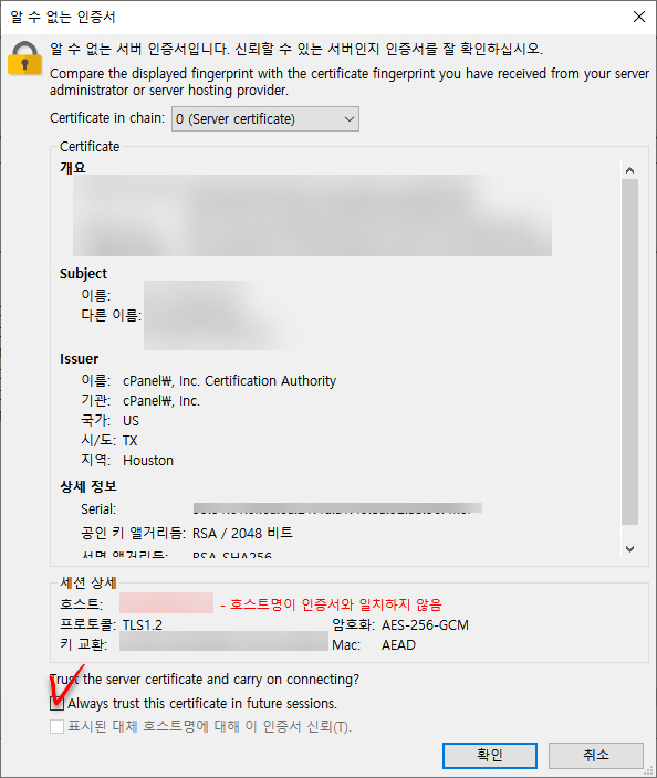 이 경고 창은 공유호스팅 상품에서 흔히 나타나는 것 같습니다. Always trust this certificate in future sessions (추후 세션에서 이 인증서 항상 신뢰) 체크박스를 선택하고 "확인"을 클릭합니다.
