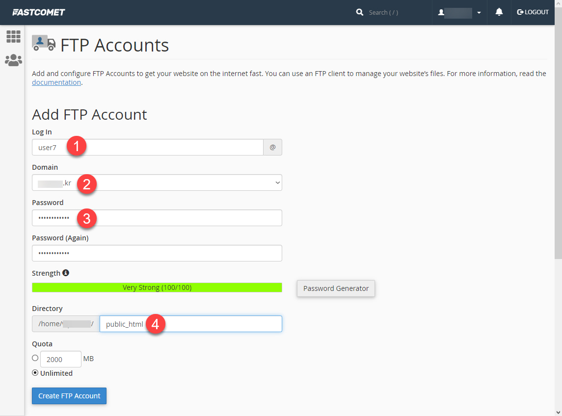 - Directory에는 FTP에 접속 시 경로를 지정합니다. public_html을 입력하면 웹 파일들이 위치한 루트 디렉터리로 접속됩니다. 여러 개의 사이트가 있고, 해당 FTP 계정으로 특정 폴더에만 접속이 가능하도록 제한하고 싶다면 이 입력 필드에서 FTP 사용자가 접근 가능한 폴더를 지정할 수 있습니다.