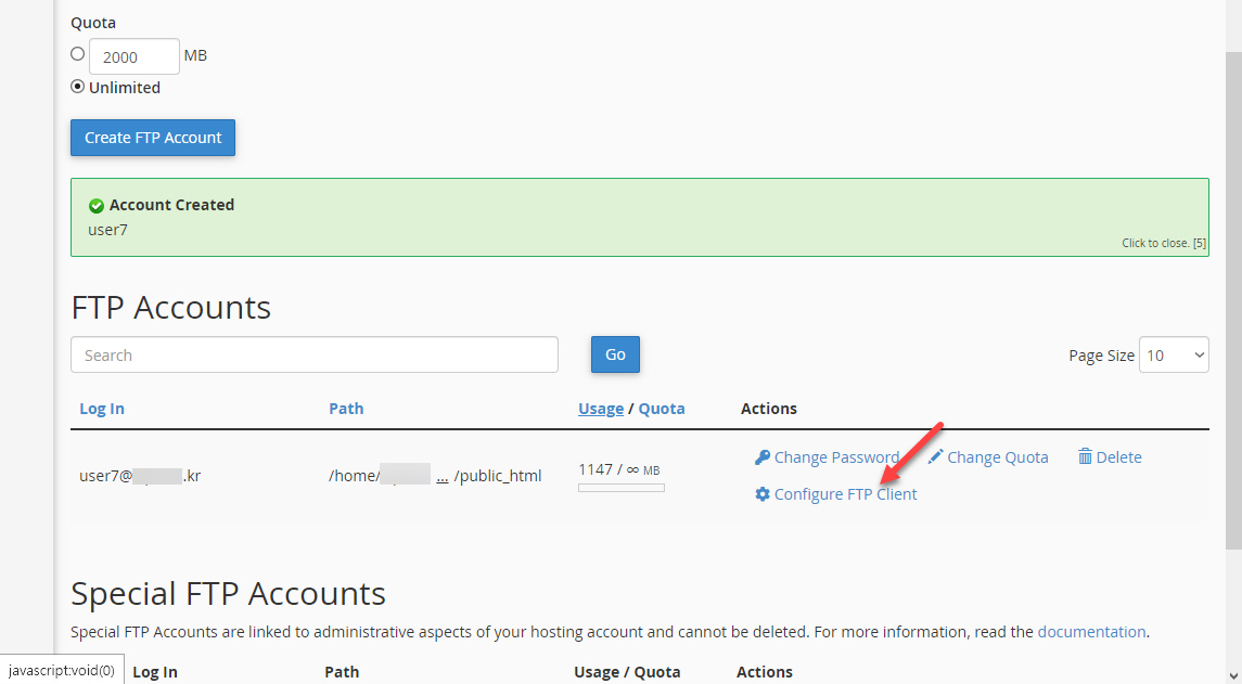 Crate FTP Account 버튼을 클릭하면 FTP 계정이 추가되고 하단에 표시됩니다.