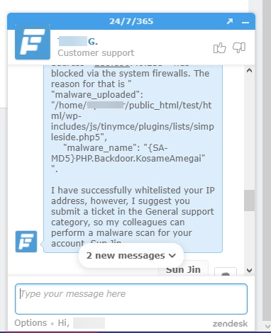 지원 담당자가 멀웨어 때문에 시스템 방화벽에 의해 내 IP 주소가 차단되었다면서 내 IP 주소를 풀어주었습니다. 그러면서 General 지원 카테고리로 티켓을 제출하여 멀웨어 스캔을 요청하라고 알려주었습니다.