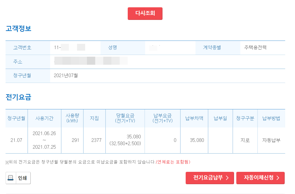 2021년 8월 4일 추가: 오늘 한전 사이트에서 전기요금을 조회해보니 6월 26일~7월 25일 전기요금이 35,080원(TV 수신료 포함)으로 나오네요. 7월 중순부터 에어컨을 본격적으로 가동했다고 감안해도 전기요금이 생각보다 적게 나왔습니다. 옆 라인에 거주하는 이웃의 경우 전기요금이 7만원 넘게 나왔다고 하네요. 구형 에어컨을 사용하면 전기 소비가 더 높을 가능성이 있을 것 같습니다. (참고로 7월에는 평소보다 건조기를 덜 튼 것도 영향을 미친 것이 아닐까 생각됩니다.)