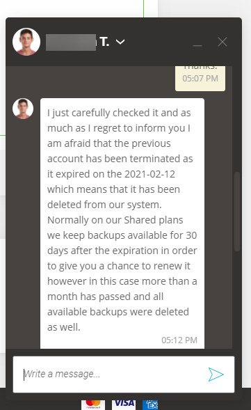 사이트그라운드에 라이브채팅으로 연락해보니 클라이언트의 호스팅 상품이 지난 2월에 종료되었다고 하네요. 만료 후 30일간 백업본을 유지하지만 고객 건의 경우 모든 백업이 삭제되어 복구가 불가능하다는 답변을 받았습니다.