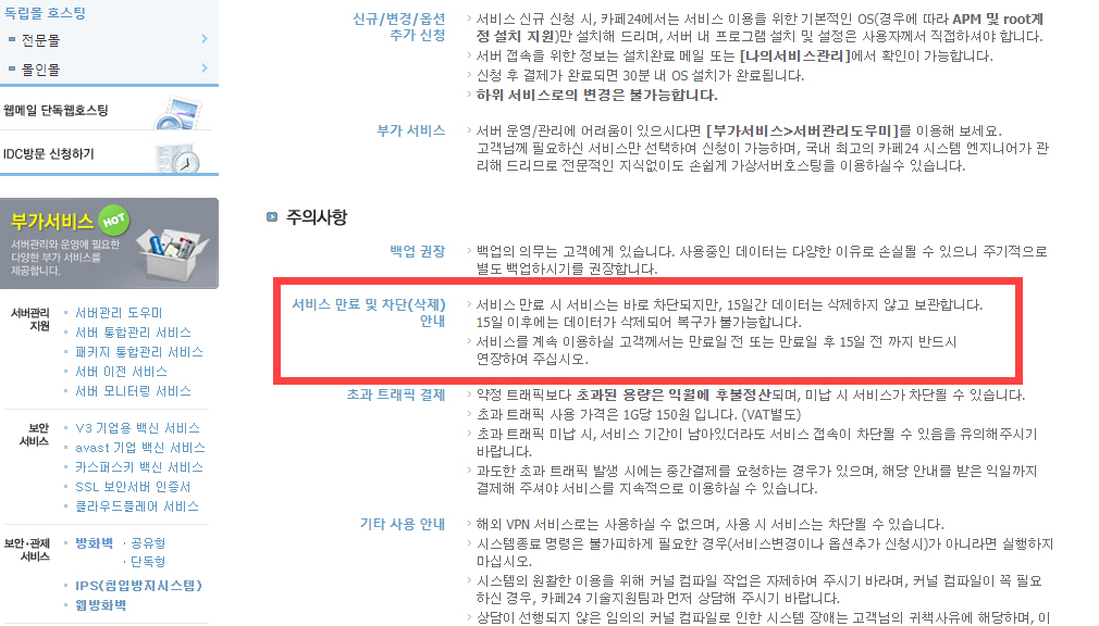 카페24의 경우 서비스 종료일 후 15일 간 데이터는 삭제되지 않고 보관된다고 합니다. 15일 이후에는 데이터가 완전히 삭제되어 복구가 불가능해집니다. (몇 년 전에는 30일 간 보관했던 것 같은데, 기간을 단축한 것으로 보이네요.)