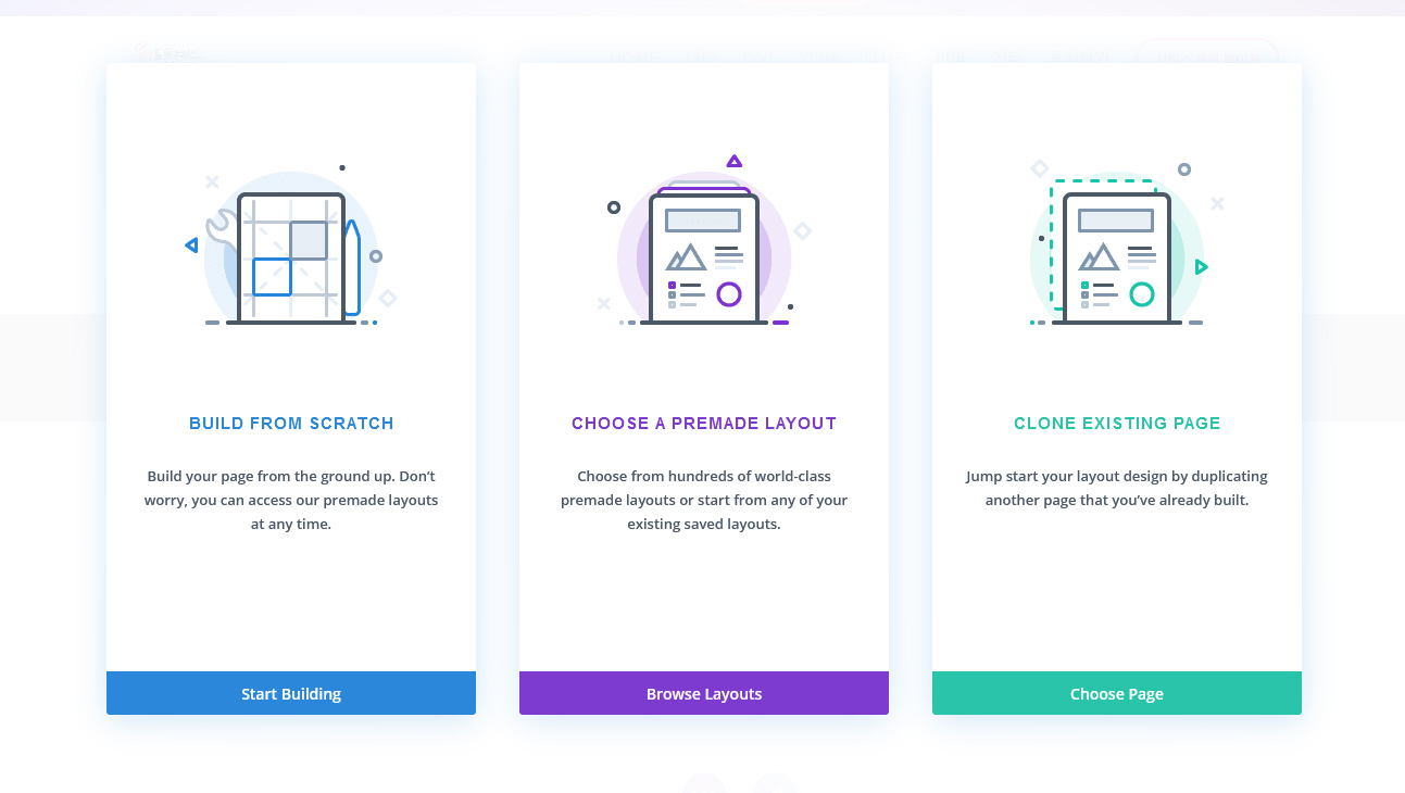 Divi 테마에서 페이지 생성 시 Divi 빌더를 사용하면 다음과 같은 3가지 옵션이 제공됩니다.
