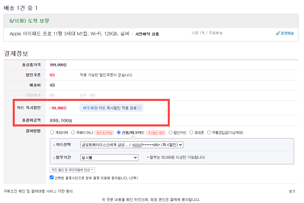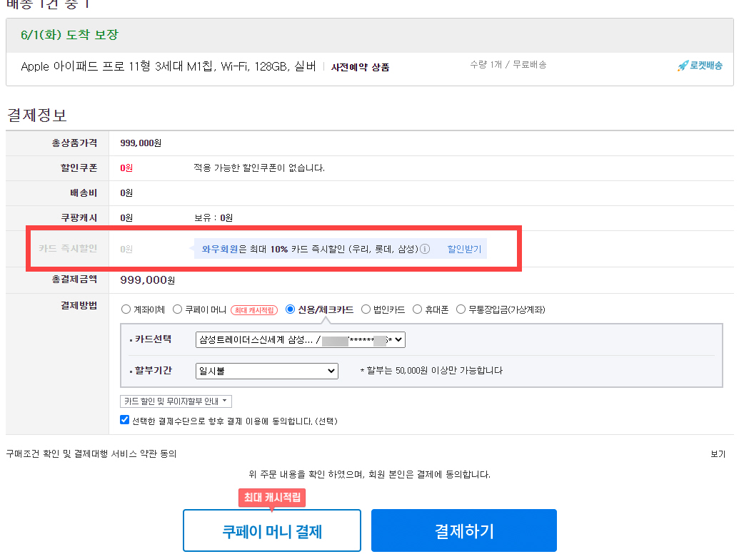 저는 쿠팡에서 진행하는 아이패드 프로 사전 예약 구매를 통해 구입했습니다. 삼성카드, 우리카드, 롯데카드가 연결된 와우회원은 10% 즉시 할인을 받을 수 있습니다. 이번 기회에 와우회원에 가입했습니다.