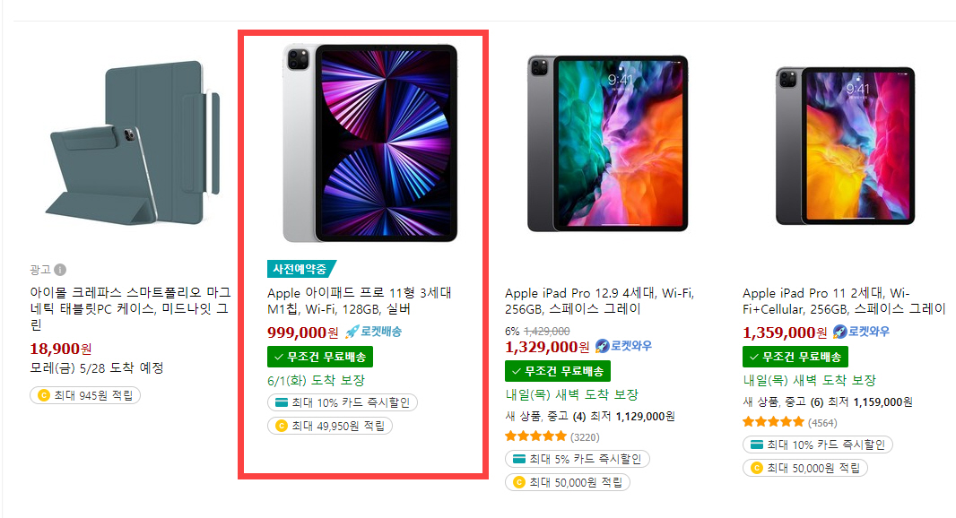 저는 쿠팡에서 아이패드 프로 5세대 중 가장 저렴한 11형 와이파이 제품을 선택했습니다.