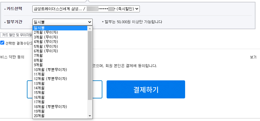카드에 따라 무이자 할부 선택도 가능합니다. 저는 6개월 무이자 할부를 이용할 수 있지만, 개인적으로 할부를 별로 좋아하지 않습니다. 무이자 할부를 잘 이용하면 편리하지만 꼭 필요한 경우가 아니면 할부로 구입하지 않습니다.