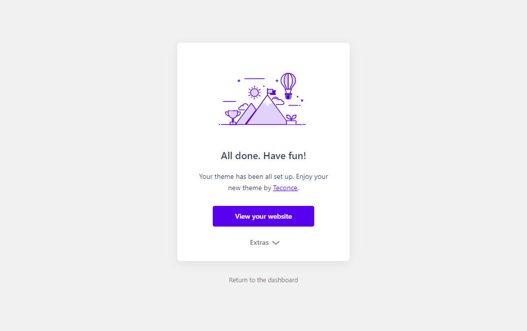 마법사(Wizard)를 사용하여 차일드 테마와 필요한 플러그인을 설치하고 콘텐츠(데모)를 임포트할 수 있습니다.