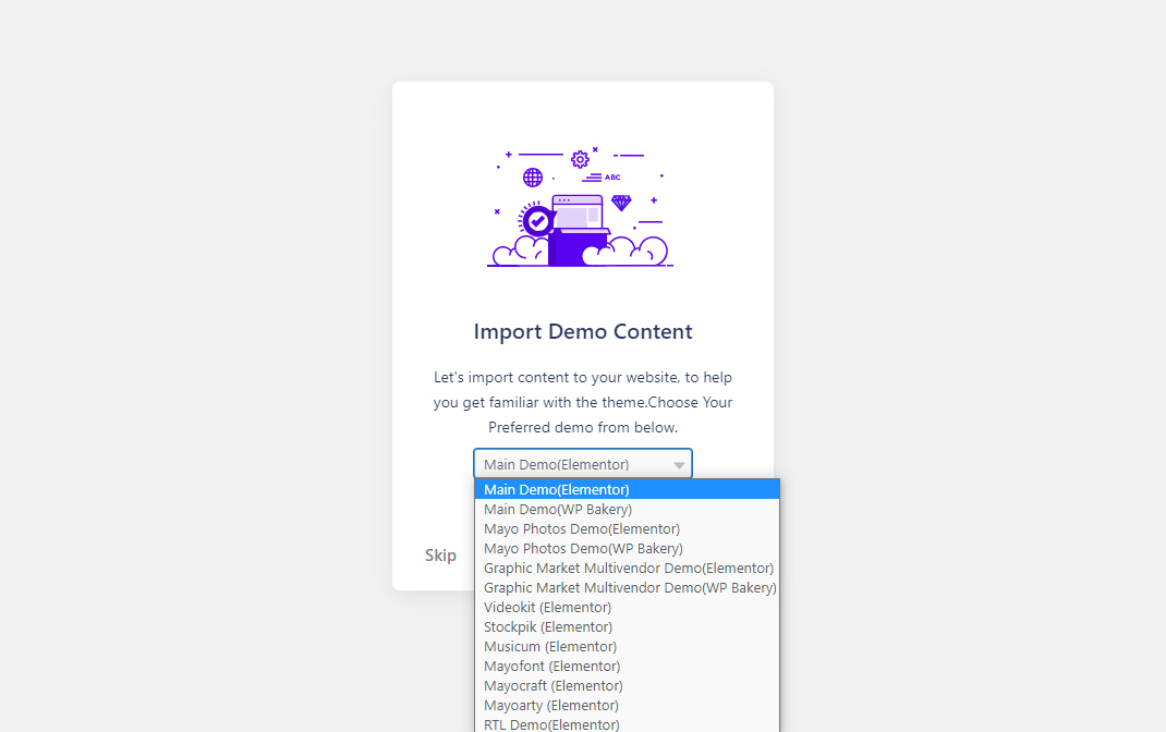 Mayosis 테마를 업로드하여 설치하고 활성화하면 Mayosis 마법사가 실행됩니다.