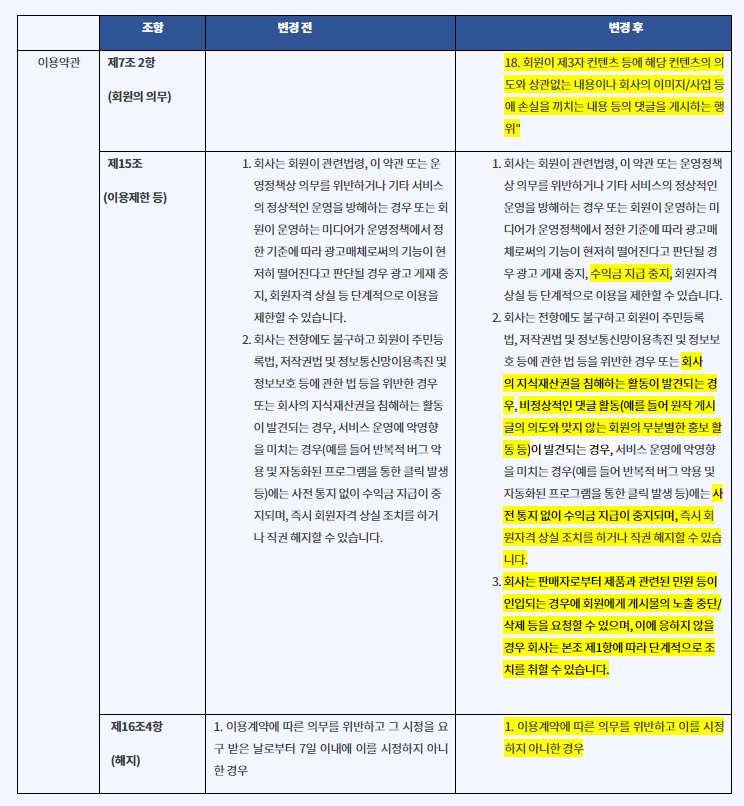 지난달 중순, 쿠팡은 제3자 콘텐츠 등에 해당 콘텐츠의 의도와 상관없는 내용이나 회사의 이미지/사업 등에 손실을 끼치는 내용 등의 댓글을 게시하는 행위에 대하여 사전 통지 없이 수익금 지급을 중지하고 즉시 회원자격을 상실시킬 수 있도록 정책을 개정했습니다.