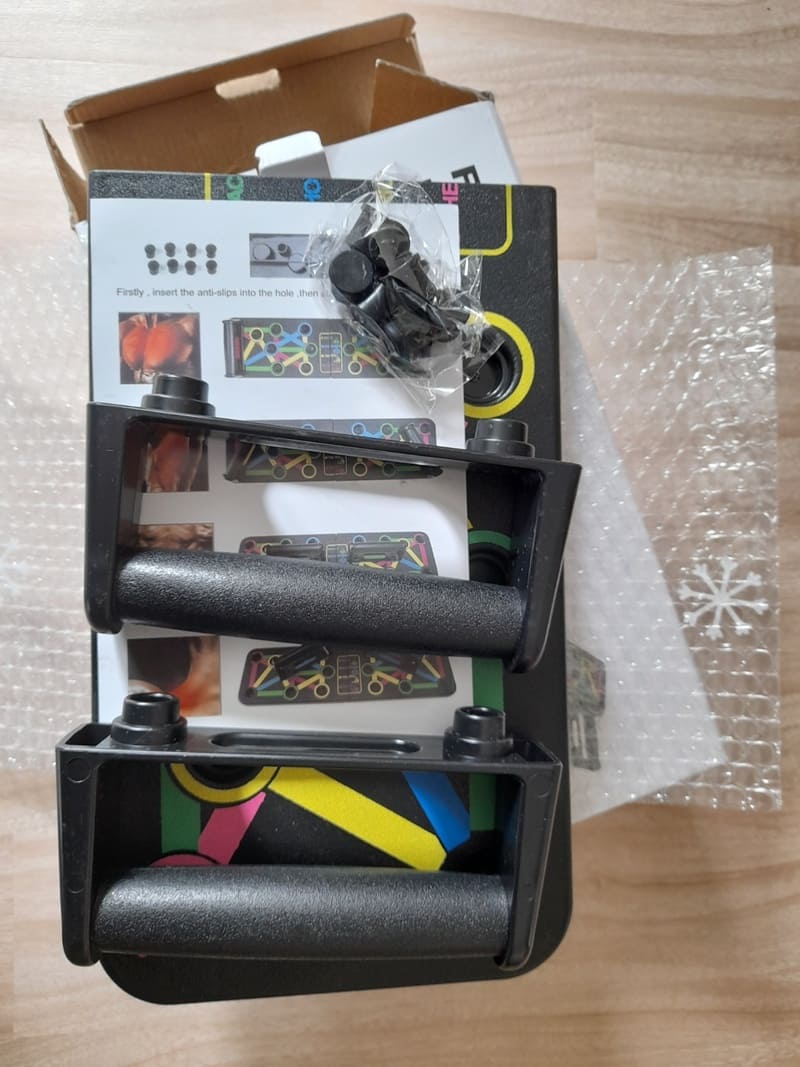 포장을 개봉하면 푸쉬업바, 보드, 캡, 설명서(1장)가 들어있습니다.