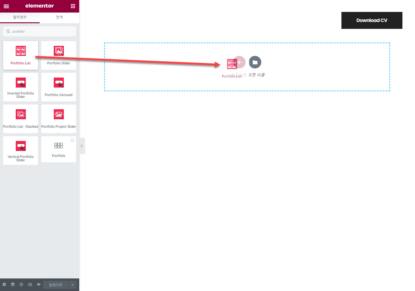 포트폴리오 페이지에 Portfolio List 위젯을 적절한 위치로 끌어도 놓습니다.