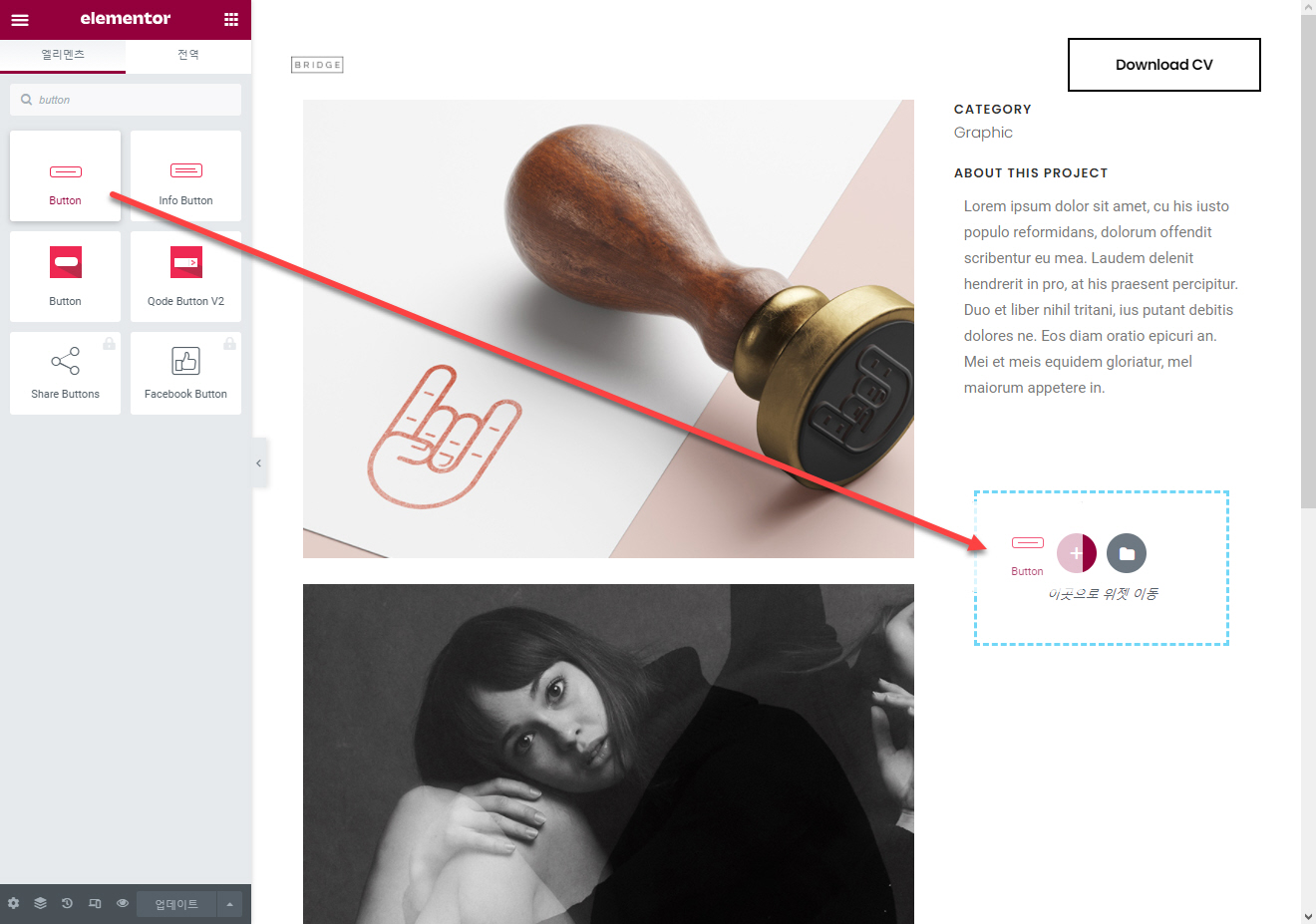 이제 개별 포트폴리오 편집 페이지에서 오른쪽의 적당한 위치에 Button 엘리먼트를 추가합니다.