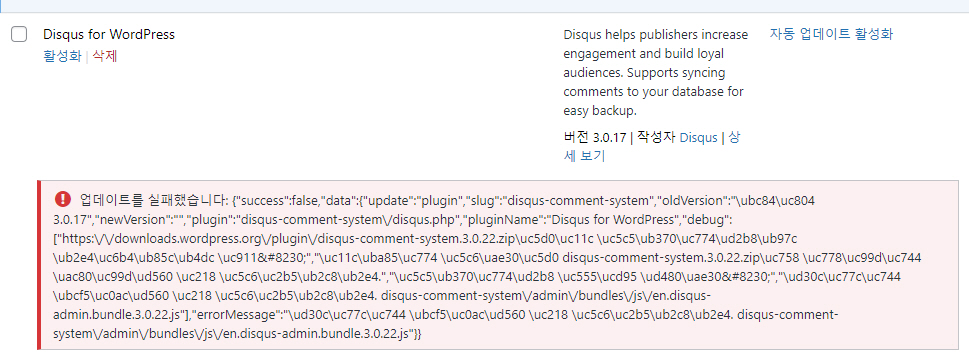Disqus for WordPress 플러그인을 업데이트하려고 시도했을 때 다음과 같은 에러 문구를 표시하면서 업데이트에 실패했습니다.