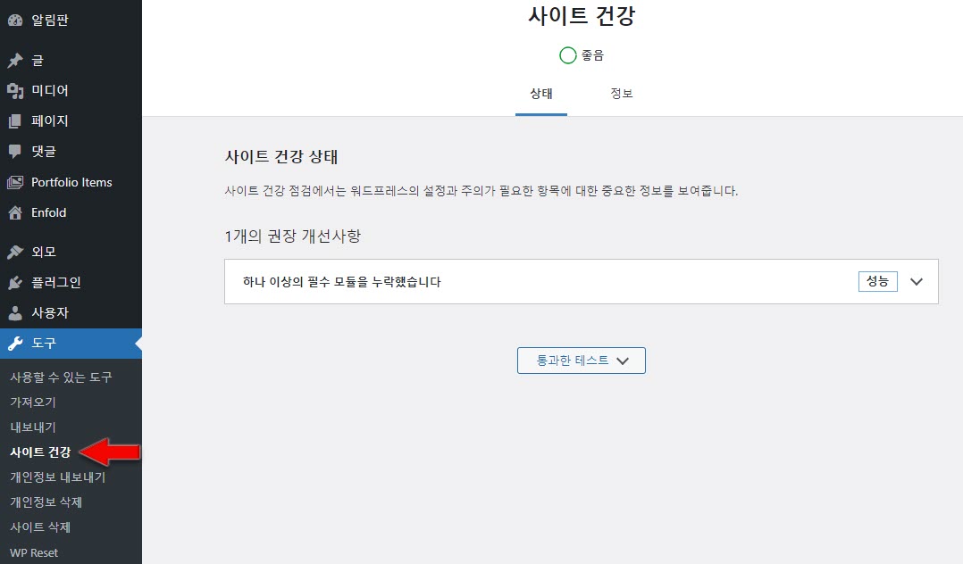 그래도 해결이 안 되면 도구 > 사이트 건강으로 이동하여 문제가 표시되지 않는지 확인해보시기 바랍니다.