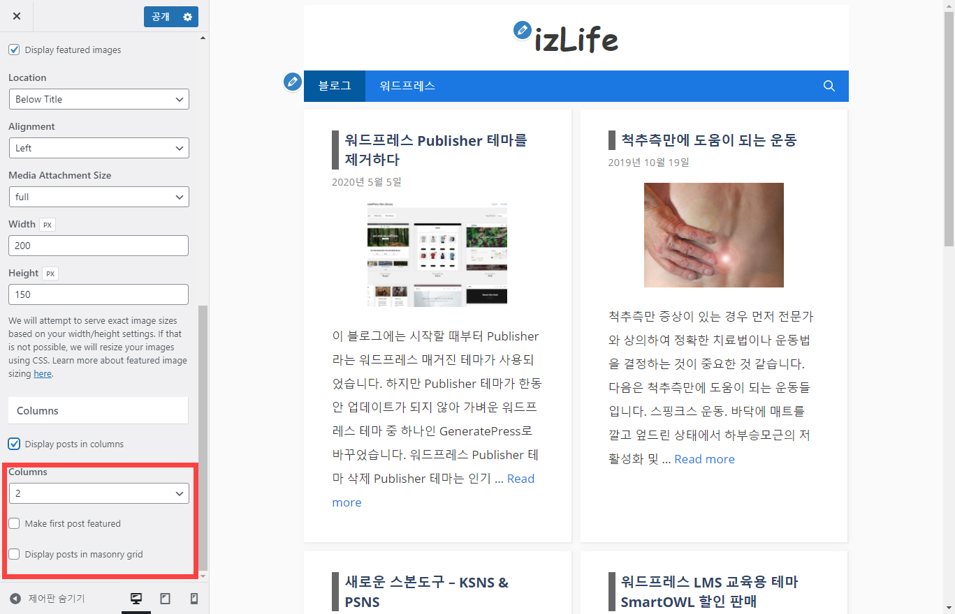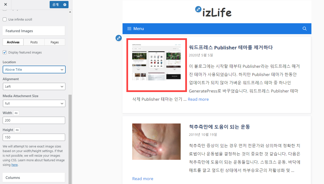 아래의 Featured Images 섹션에서는 아래와 비슷하게 설정하도록 합니다.
