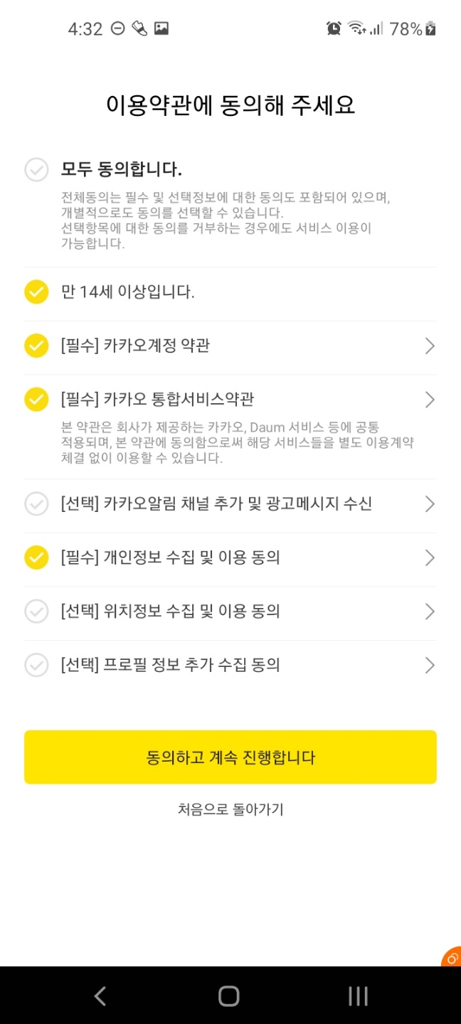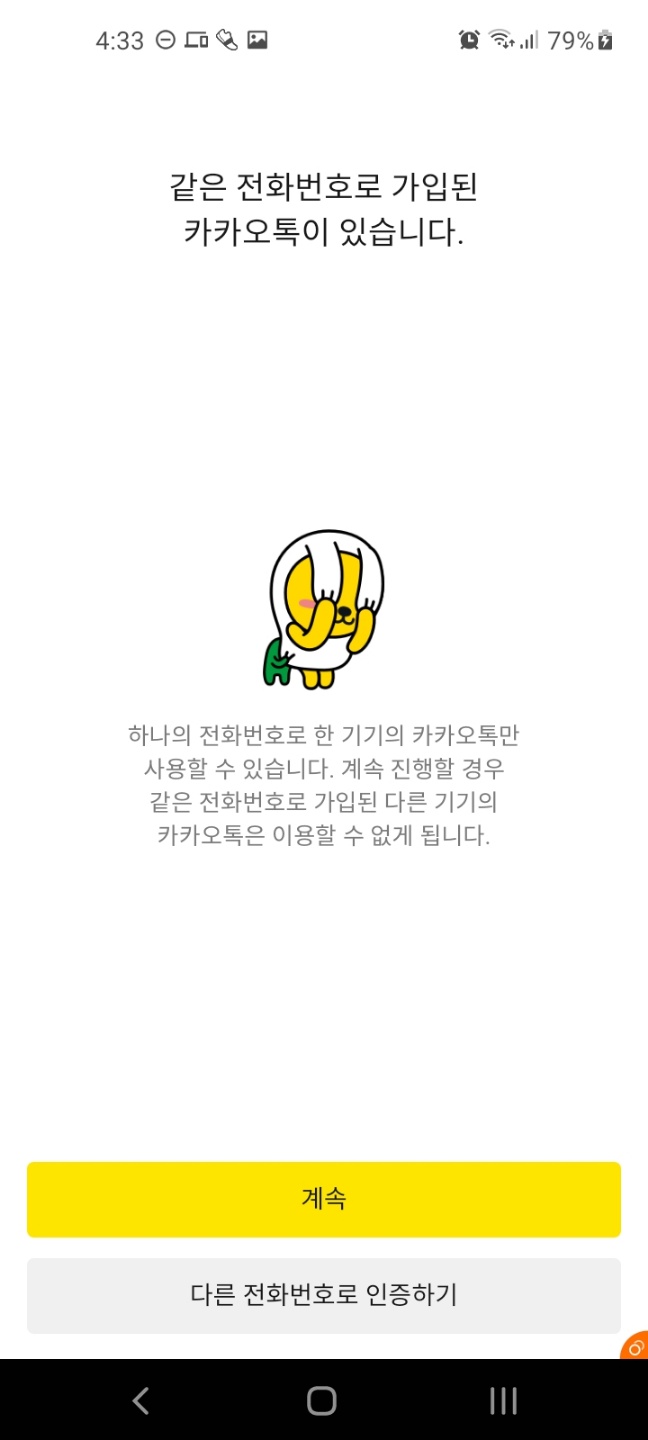 해당 번호로 이미 다른 폰에 카카오톡이 설치되어 있다면 '같은 전화번호로 가입된 카카오톡이 있습니다'가 표시됩니다. 그렇지 않은 경우에는 곧바로 카톡 계정이 생성됩니다.
