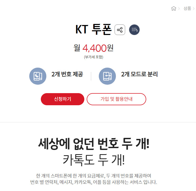 KT에서는 투폰 서비스를 이용할 수 있습니다. 이용요금은 월 4,400원(부가세포함)입니다.