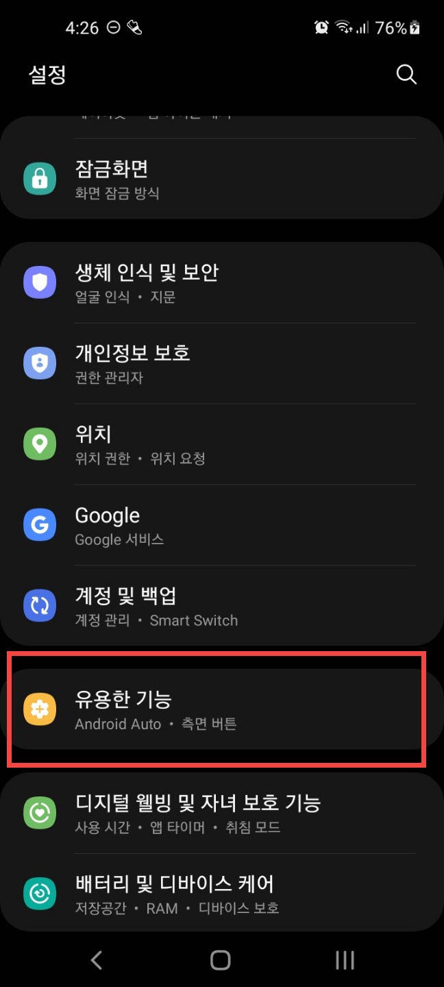 갤럭시폰을 사용하는 경우 이 기능을 활성화하려면 설정 > 유용한 기능으로 이동합니다.