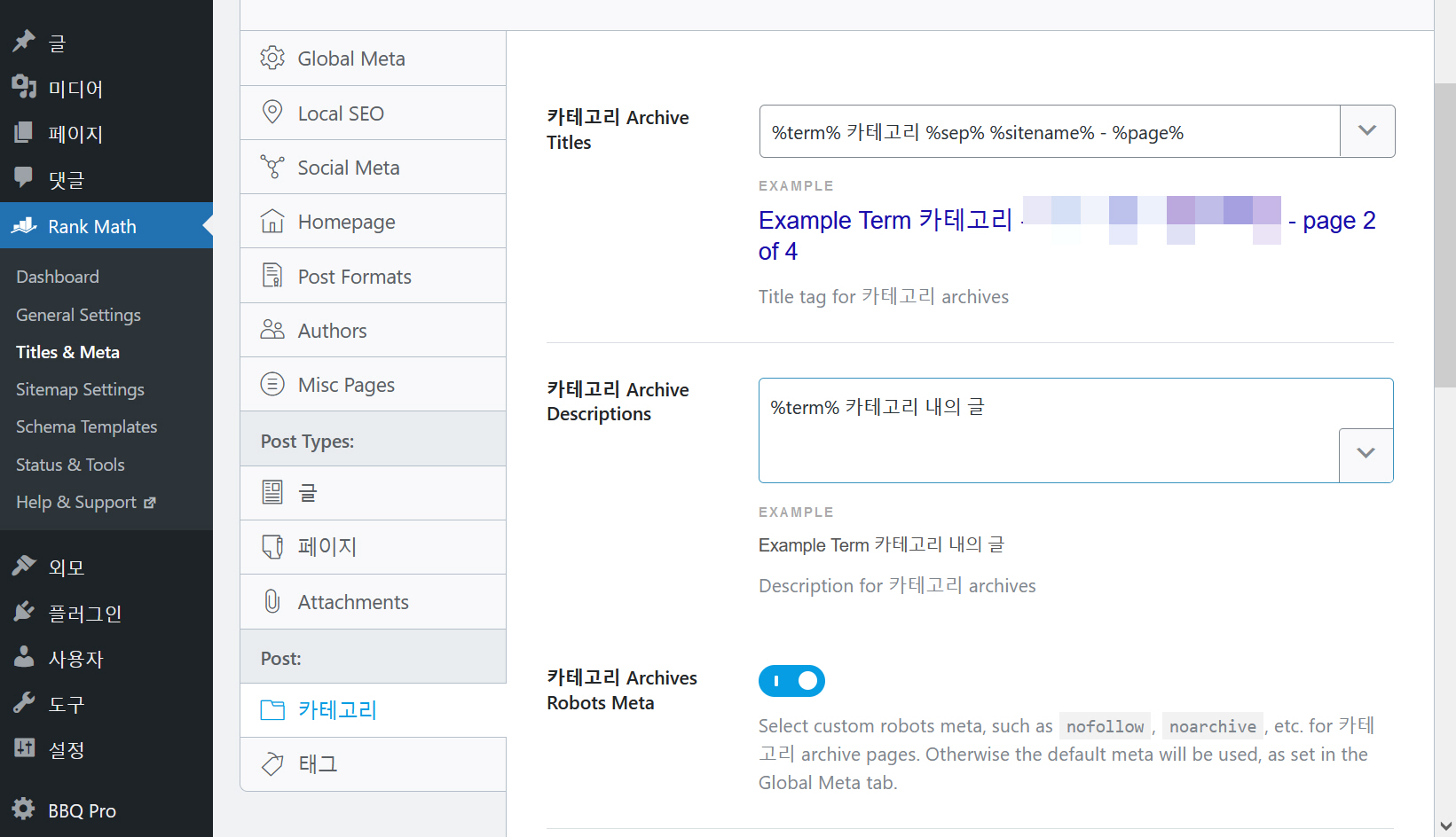 알림판 > Rank Math > Titles & Meta > Post: > 카테고리에서 카테고리 아카이브 제목(Archive Titles)과 카테고리 아카이브 설명(Archive Descriptions)을 지정할 수 있습니다.