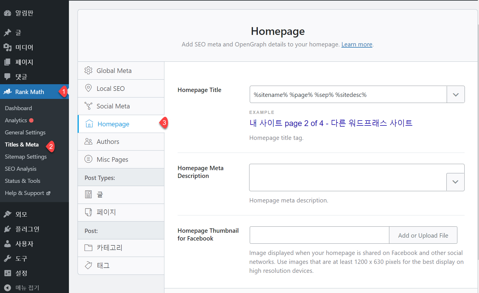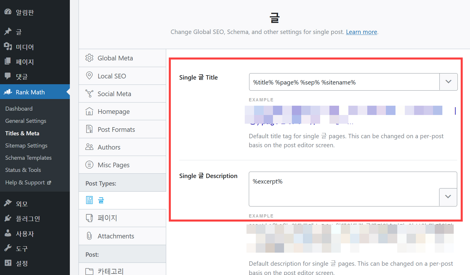 글 포스트 타입은 알림판 > Rank Math > Titles & Meta > Post Types: > 글에서 페이지 포스트 타입은 알림판 > Rank Math > Titles & Meta > Post Types: > 페이지에서 SEO 글 제목과 설명을 지정할 수 있습니다.