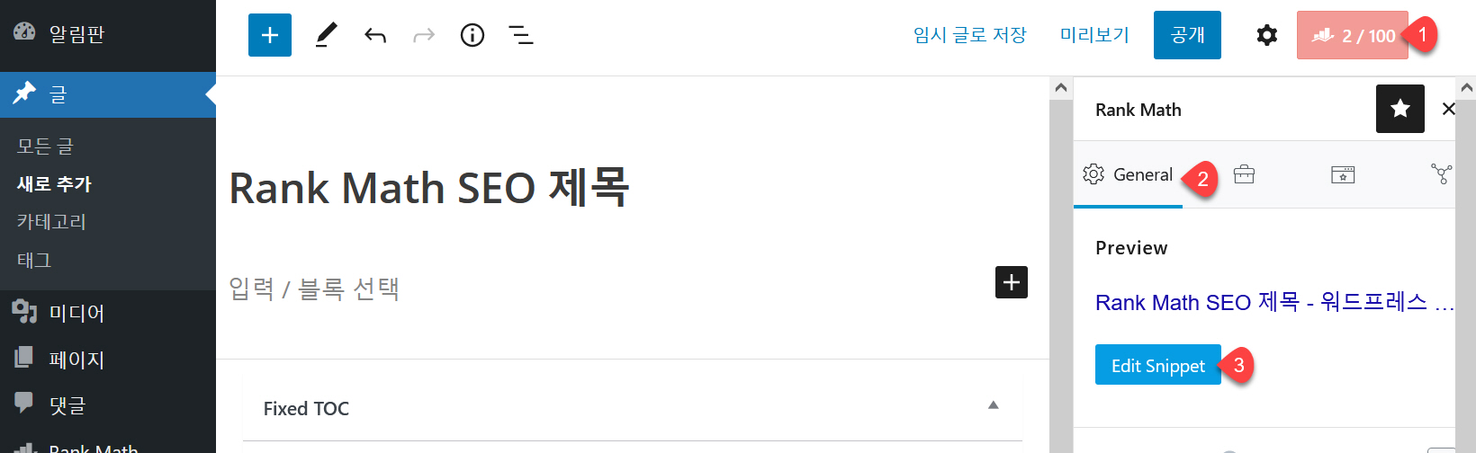 개별 페이지와 글에서도 동일한 방식으로 SEO 제목을 설정할 수 있습니다. 예를 들어, 개별 글에서 SEO 제목과 설명을 설정하려면 글 편집 화면에서 오른쪽 상단의 Rank Math 점수가 표시된 아이콘을 클릭하고 General 탭의 Edit Snippet(스니펫 편집)을 클릭하도록 합니다.